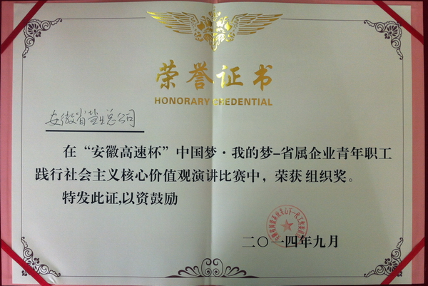 9月26日下午,由安徽省关心下一代工作委员会、安徽省国资系统关心下一代工作委员会主办的“安徽高速杯”中国梦·我的梦——省属企业青年职工践行社会主义核心价值观演讲比赛决赛,在安徽省高速集团隆重举行。省公司在此次比赛中荣获集体组织奖,代表省公司参加比赛的庐江县公司职工柯君凭借雄厚的实力和精彩的发挥荣获个人一等奖。
